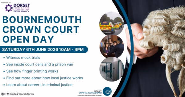 On Saturday 6th June 2026, Bournemouth Crown Court will be opening its doors to the public from 10am to 4:00pm. There will be tours of the cells, an opportunity to observe and participate in mock trials as jurors, talks from those involved in the criminal justice system and stalls provided by local criminal justice agencies and charities involved in the criminal justice system. It will be a good opportunity to find out about working in all parts of the criminal justice system. There is no need to pre-book.